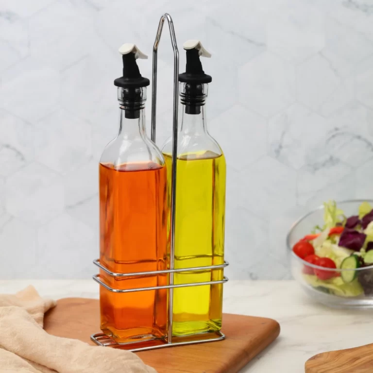 Set of oil and vinegar bottles with metal rack, convenient for carrying.