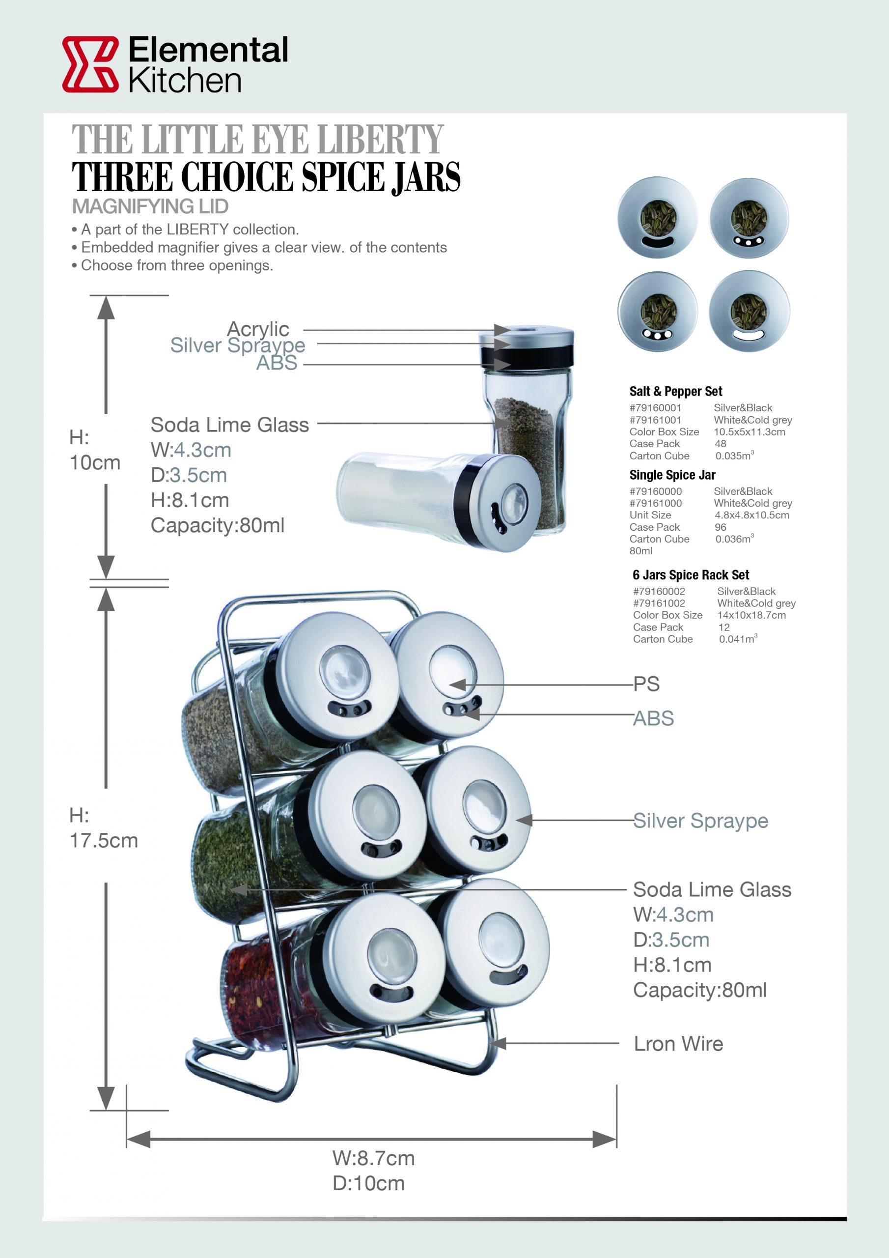 With a stylish black and stainless-steel lid available on two of our popular spice jar shapes, the LITTLE EYE is great to look at. But it’s also great to look through. Embedded in the top is a small magnifier that lets you see clearly the contents in the jar. A twist of the top gives you three choices of openings for your favorite flavors.